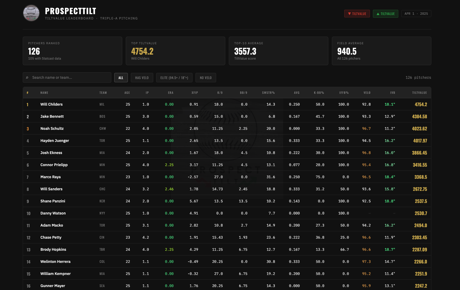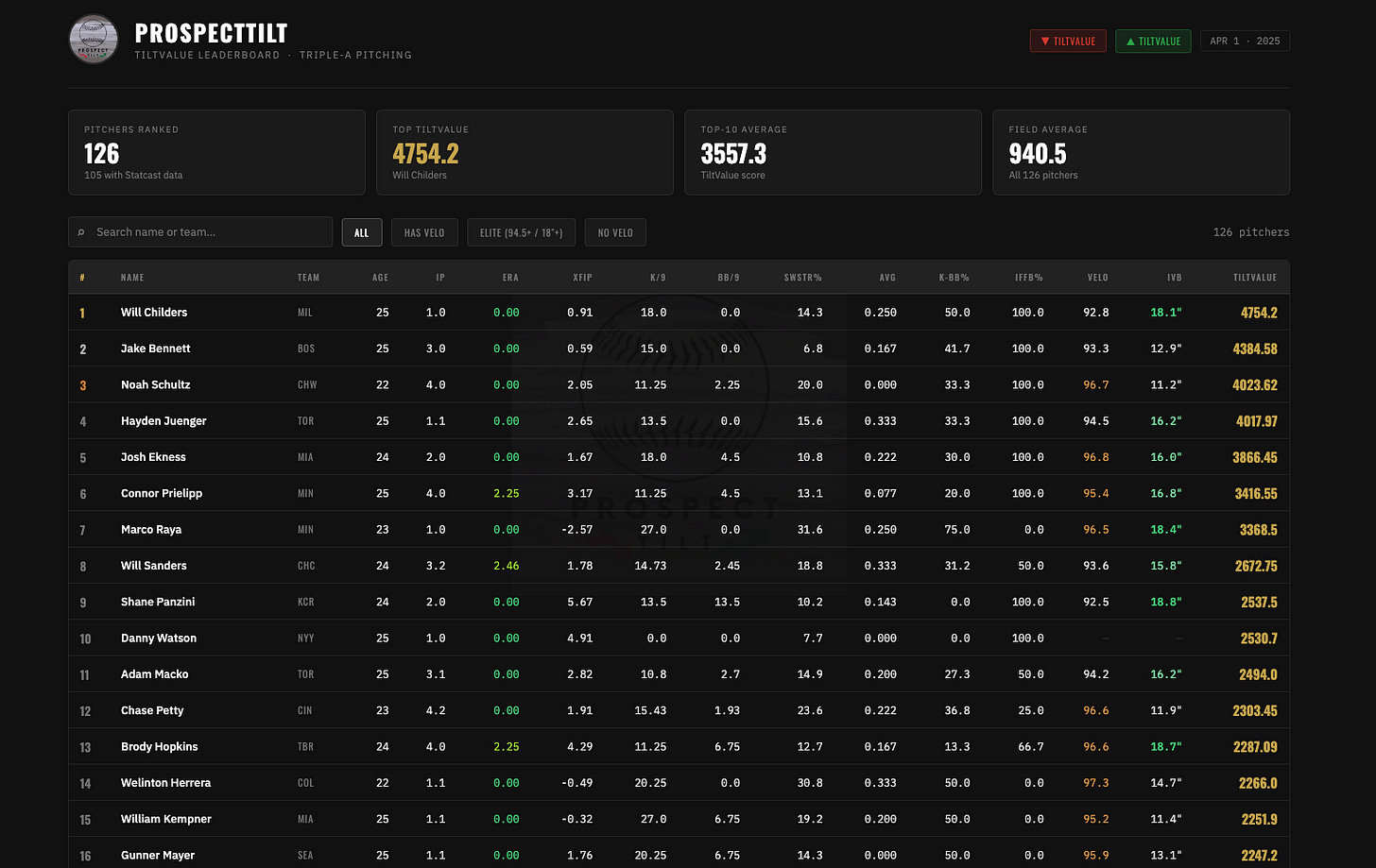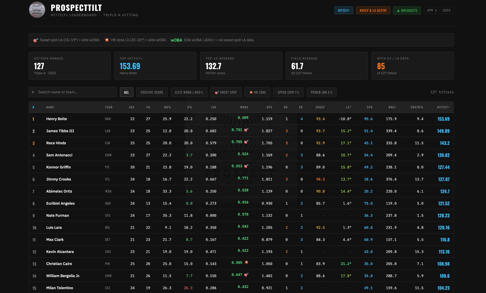 Are you a passionate baseball enthusiast with a keen interest in unearthing the future stars of America's favorite pastime? Look no further! ProspectTilt is your go-to destination for comprehensive baseball prospect rankings, cutting-edge statistics, data analysis, and captivating visualizations, all meticulously curated to elevate your Dynasty Baseball experience.