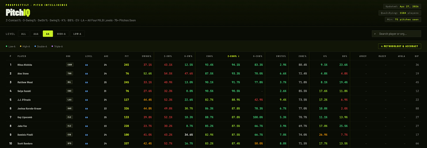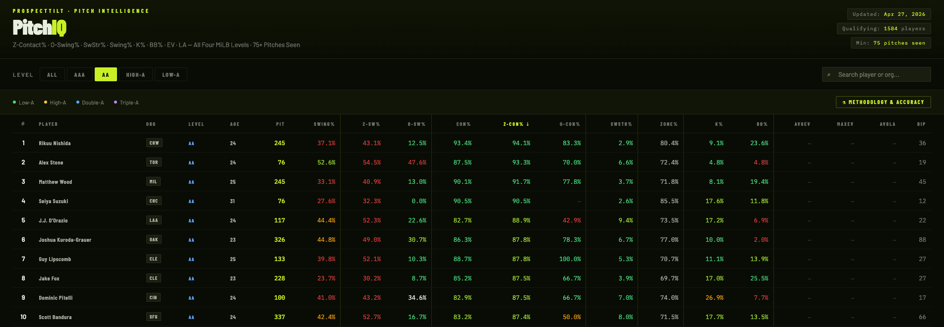 PitchIQ is a pitch intelligence leaderboard covering all four levels of affiliated minor league baseball — Triple-A, Double-A, High-A, and Low-A — tracking every qualifying batter who has seen 75 or more pitches this season. It updates automatically every morning. It is, to my knowledge, the most comprehensive publicly available pitch discipline resource for MiLB hitters that exists right now. I could be wrong and you can point me in the right direction - but most of what I see and find is for Low-A and Triple-A only.