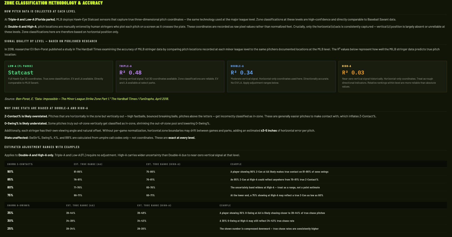 The transparency is built in. PitchIQ doesn’t hide its methodology. Every limitation is documented directly on the site — the difference between Statcast-quality data at Triple-A and Low-A versus the manually stringed coordinate data at Double-A and High-A, the adjustment ranges you should apply when reading Z-Contact% and O-Swing% at the lower levels, the research behind the accuracy estimates. You know exactly what you’re looking at and exactly how much to trust it.