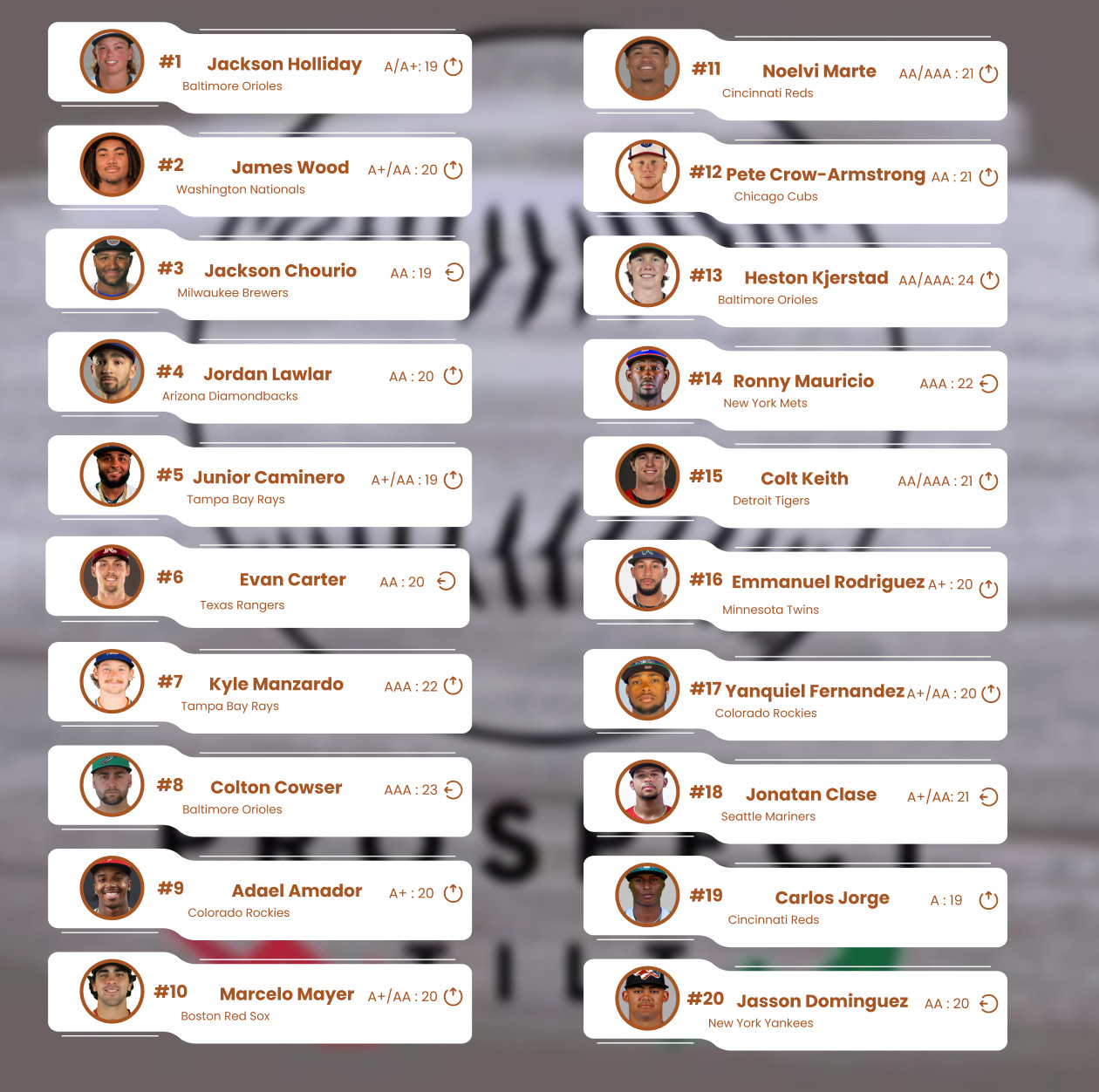 Prospect Rankings: Uncover the rising stars and future legends with meticulously crafted prospect rankings. Whether you're a seasoned Dynasty Baseball manager or just starting your journey, ProspectTilt rankings will help provide you with a roadmap for success!