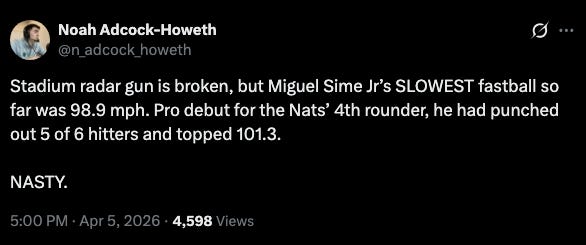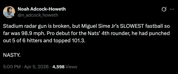 I don’t throw the word generational around loosely. I’m not throwing it around here either. What I am saying is that a teenager built like that throwing 99 to 101 in Low-A is a sentence that doesn’t come along very often and when it does you put everything down and pay attention. The Nationals have something here that nobody is talking about yet. Monitoring. Heavily. Immediately. Right now.